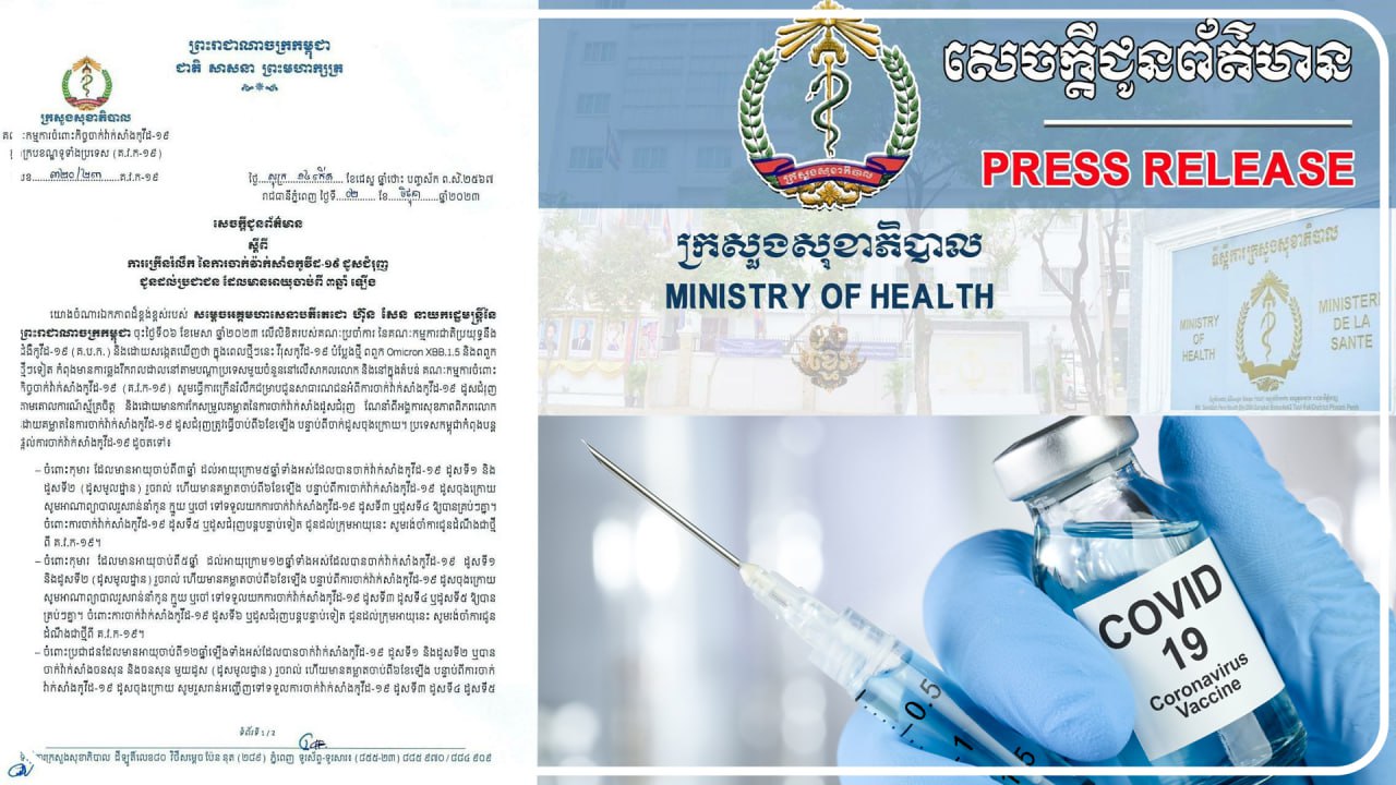 ភ្នំពេញ÷ក្រសួងសុខាភិបាលកម្ពុជានៅព្រឹកថ្ងៃទី2 ខែមិថុនាឆ្នាំ 2023 បានចេញសេច ក្តីជូនដំណឹងស្ដីពីការក្រើនរម្លឹកអំពីការចាក់វ៉ាក់សាំងកូវីដ-19"ដូសជំរុញ"ជូនដល់ប្រជា ជនដែលមានអាយុចាប់ពី3ឆ្នាំឡើងទៅ។ នៅក្នុងសេចក្តីជូនដំណឹងរបស់ក្រសួងបានបញ្ជាក់ថាយោងចំណារឯកភាពដ៏ខ្ពង់ខ្ពស់របស់សម្ដេចអគ្គមហាសេនាបតីតេជោហ៊ុនសែននាយករដ្ឋមន្ត្រីនៃព្រះរាជាណាចក្រកម្ពុជាចុះថ្ងៃទី 6 ខែមេសាឆ្នាំ2023លើលិខិតរបស់គណ:ប្រចាំការនៃគណ:កម្មការជាតិប្រយុទ្ធនឹងជំងឺកូវីដ-19(គ.ប.ក.)និងសង្កេតឃើញថាក្នុងពេលថ្មីៗនេះវីរុសកូវីដ-19បំប្លែងថ្មីពពួកOmicron XBB.1.5និងពពួកថ្មីៗទៀតកំពុងមានការឆ្លងរីករាលដាលនៅតាមប្រទេសុមួយចំនួននៅលើសកលលោកនិងនៅក្នុងតំបន់គណ: កម្មការចំពោះកិច្ចចាក់វ៉ាក់សាំងកូវីដ-19 (គ.វ.ក-19)សូមធ្វើការក្រើនរម្លឹកជម្រាបជូនសាធារណជនអំពីការចាក់វ៉ាក់សាំងកូវីដ-19 ដូសជំរុញតាមតាមគោលការណ៍ស្ម័គ្រចិត្តនិងដោយមានការកែសម្រួលគម្លាតនៃការចាក់វ៉ាក់សាំងដូសជំរុញណែនាំពីអង្គការ សុខភាពពិភពលោកដោយគម្លាតនៃការចាក់វ៉ាក់សាំងកូវីដ-19ដូសជំរុញត្រូវធ្វើចាប់ ពី6ខែឡើងបន្ទាប់ពីចាក់ដូសចុងក្រោយ។ប្រទេសកម្ពុជាកំពុងបន្តផ្តល់ការចាក់វ៉ាក់ សាំងកូវីដ-19ដូចតទៅ÷ -ចំពោះកុមារដែលមានអាយុចាប់ពី3ឆ្នាំដល់ក្រោម5ឆ្នាំទាំងអស់ដែលបានចាក់វ៉ាកសាំងកូវីដ - 19 ដូសទី 1 និងដូសទី 2 (ដូសមូលដ្ឋាន)រួចរាល់ហើយមានគម្លាតចាប់ពី 6 ខែឡើងបន្ទាប់ពីការចាក់សាំងកូវីត- 19 ដូសចុងក្រោយសូមអាណាព្យាបាលរួសរាន់នាំកូនក្មួយឬចៅទៅទទួលយកការចាក់វ៉ាក់សាំងកូវីដ-19ដូសទី3ឬទី4ឲ្យគ្រប់ៗគ្នា។ចំពោះការចាក់វ៉ាក់សាំងកូវីដ-19ដូសទី5ឬដូសជំរុញបន្តបន្ទាប់ទៀតជូនដដល់ក្រុមអាយុនេះសូមរង់ចាំការជូនដំណឹងជាថ្មីពីគ.វ.ក-19។ -ចំពោះកុមារដែលមានអាយុចាប់ពី 5 ឆ្នាំដល់អាយុក្រោម 12 ឆ្នាំទាំងអស់ដែលបានចាក់វ៉ាក់សាំងកូវីដ-19ដូសទី 1និងដូសទី2(មូលដ្ឋាន)រួចរាល់ហើយមានគម្លាតចាប់ពី6ខែឡើងបន្ទាប់ពីការចាក់វ៉ាក់សាំងកូវីដ-19ដូសចុងក្រោយសូមអាណាព្យាបាលរួសរាន់នាំកូនកក្មួយឬចៅទៅទទួលយកការចាក់វ៉ាក់សាំងកូវីដ-19ដូសទី3ដូសទី4ឬដូសទី5ឲ្យបានគ្រប់ៗគ្នា។ចំពោះការចាក់វ៉ាក់សាំងកូវីដ-19ដូសទី6ឬដូសជំរុញបន្តបន្ទាប់ទៀតជូនដល់ក្រុមអាយុនេះសូមរង់ចាំការជូនដំណឹងជាថ្មីពីគ.វ.ក-19។ -ចំពោះប្រជាជនដែលមានអាយុចាប់ពី 12 ឆ្នាំឡើងទៅទាំងអស់ដែលបានចាក់វ៉ាក់សាំងកូវីដ-19ដូសទី1និងដូសទី2ឬបានចាក់វ៉ាក់សាំងចនសុននិងចនសុន1ដូស(ដូសមូលដ្ឋាន)រួចរាល់ហើយមានគម្លាតចាប់ពី6ខែឡើងបន្ទាប់ពីការចាក់វ៉ាក់សាំងកូវីដ-19ដូសចុងក្រោយសូមរួសរាន់អញ្ជើញទៅទទួលការចាក់វ៉ាក់សាំងកូវីដ-19ដូសទី3ដូសទី4ដូសទី5ឬដូសទី6ឲ្យបានគ្រប់ៗគ្នា។ចំពោះការចាក់វ៉ាក់សាំងកូវីដ-19ដូសទី7ឬដូសជំរុញបន្តបន