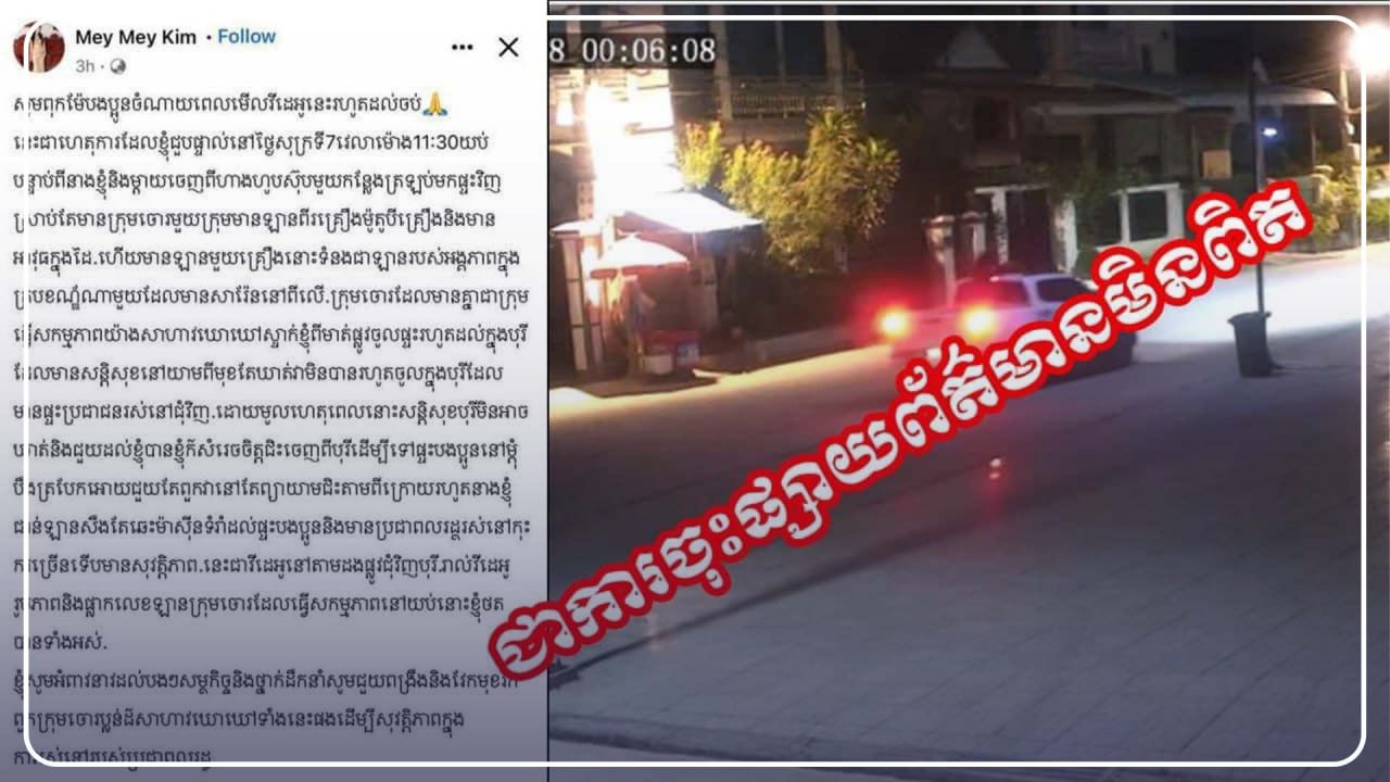 ស្នងការដ្ឋាននគរបាលរាជធានីភ្នំពេញ សូមធ្វើការបញ្ជាក់ថាការចុះផ្សាយវីដេអូនៅលើបណ្ដាញសង្គមរបស់គណនីហ្វេសប៊ុកឈ្មោះ Mey Mey Kim ថាមានករណីដេញប្លន់ដល់ក្នុងបូរី ក្រោយផ្សារព្រែកឯង កាលពីយប់ថ្ងៃសុក្រ ទី៧ ខែកក្កដា ឆ្នាំ២០២៣ វេលាម៉ោង១១:២០យប់ ជាការចុះផ្សាយព័ត៌មានមិនពិត ជាក់ស្តែងស្ត្រីខាងលើជាប់ពាក់ព័ន្ធនឹងករណីពាក្យបណ្តឹងអំពើលួច (ប្រាក់) ដែលចេញដោយព្រះរាជអាជ្ញា នៃអយ្យការអមសាលាដំបូងខេត្តកណ្តាល ចេញដីការបញ្ជាឲ្យចូលខ្លួន តែរហូតមកដល់ពេលនេះស្ត្រីរូបនោះ បានរត់គេចខ្លួន ដោយមិនបានចូលខ្លួនតាមការបញ្ជារបស់ព្រះរាជអាជ្ញាអមសាលាដំបូងខេត្តកណ្តាលនោះឡេីយ ៕